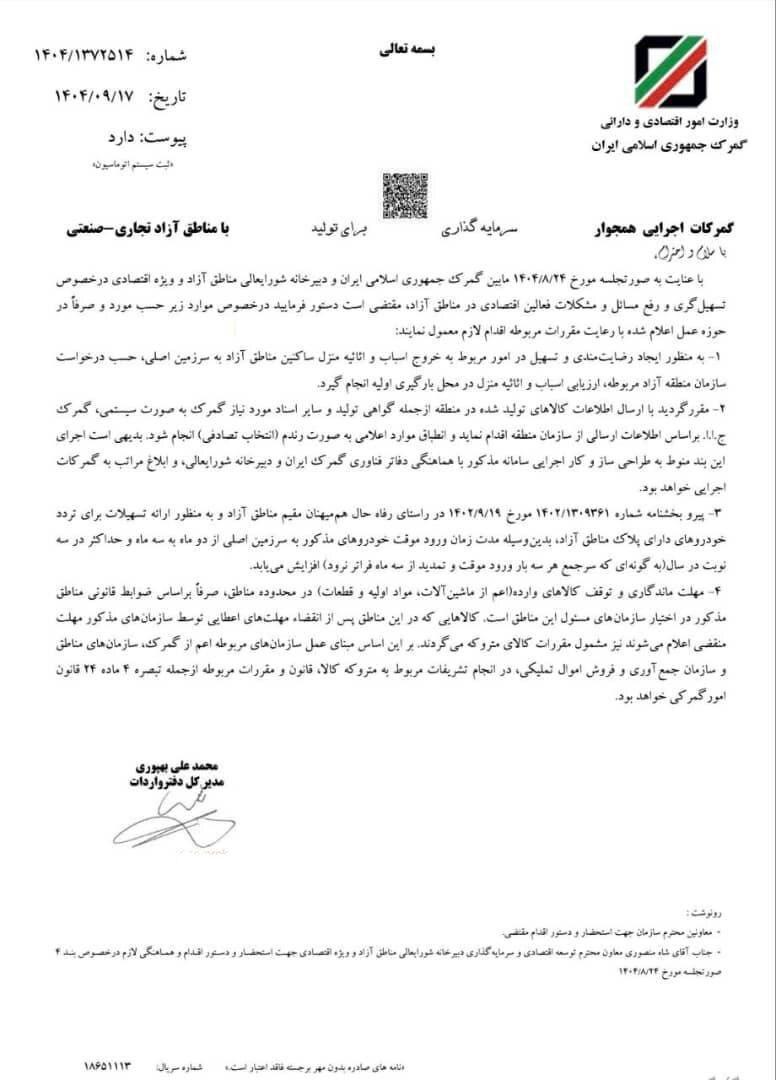گمرک جمهوری اسلامی ایران، تسهیلات جدیدی را برای فعالان اقتصادی در مناطق آزاد ابلاغ نموده است.