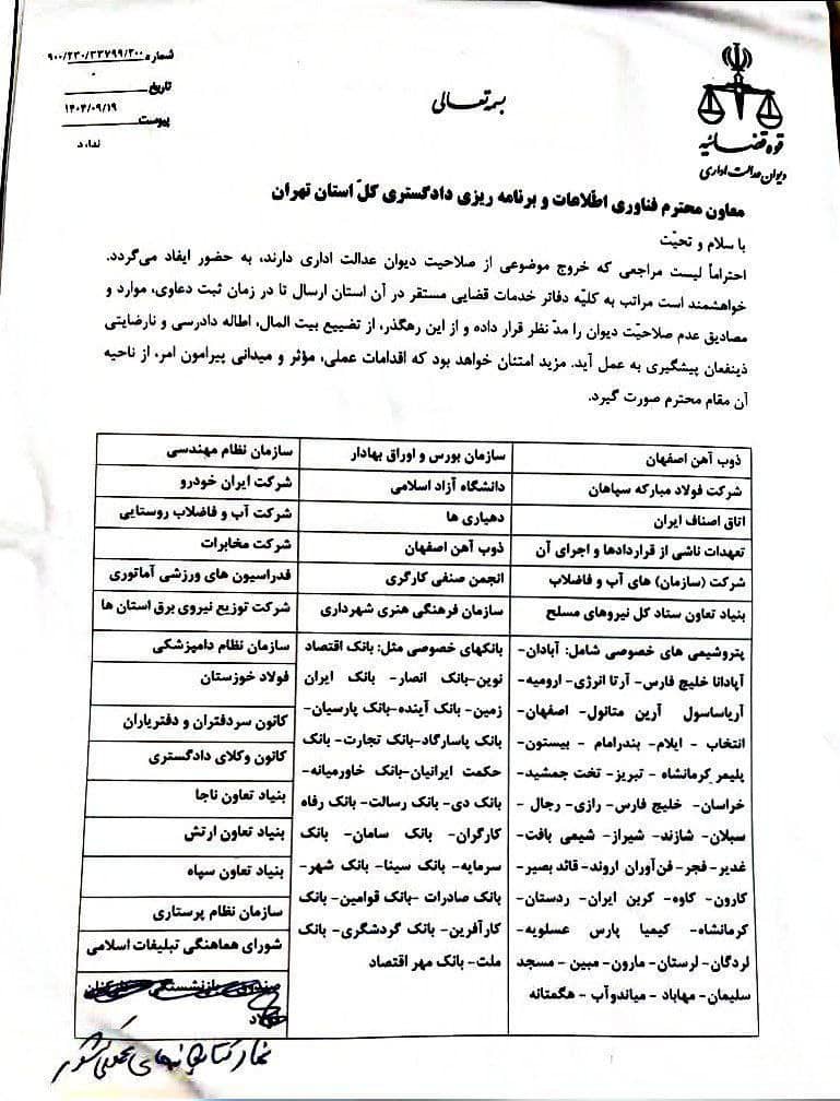 دیوان عدالت اداری با صدور بخشنامه ای جدید لیست مراجعی که از صلاحیت ذاتی دیوان خارج است را برای جلوگیری از طرح دعاوی به دادگستری تهران ابلاغ کرد.