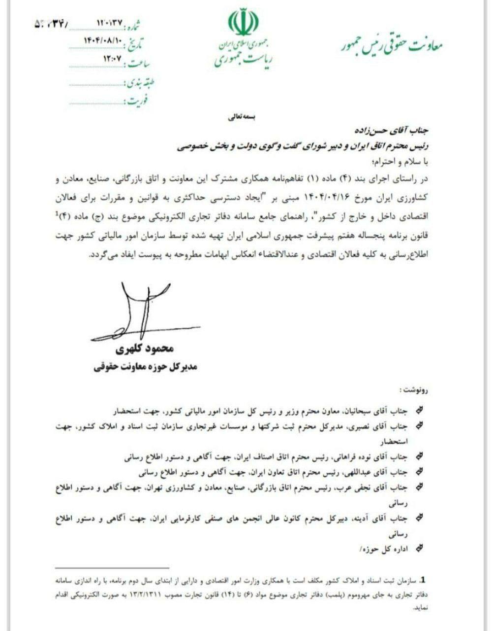 در اقدامی مهم برای شفاف‌سازی و تسهیل فضای کسب‌وکار، معاونت حقوقی رئیس‌جمهور با ارسال دستورالعمل جامع «سامانه دفاتر تجاری الکترونیکی» به اتاق بازرگانی، گام بلندی در راستای اجرایی‌سازی دسترسی حداکثری فعالان اقتصادی داخلی و خارجی به قوانین برداشت.